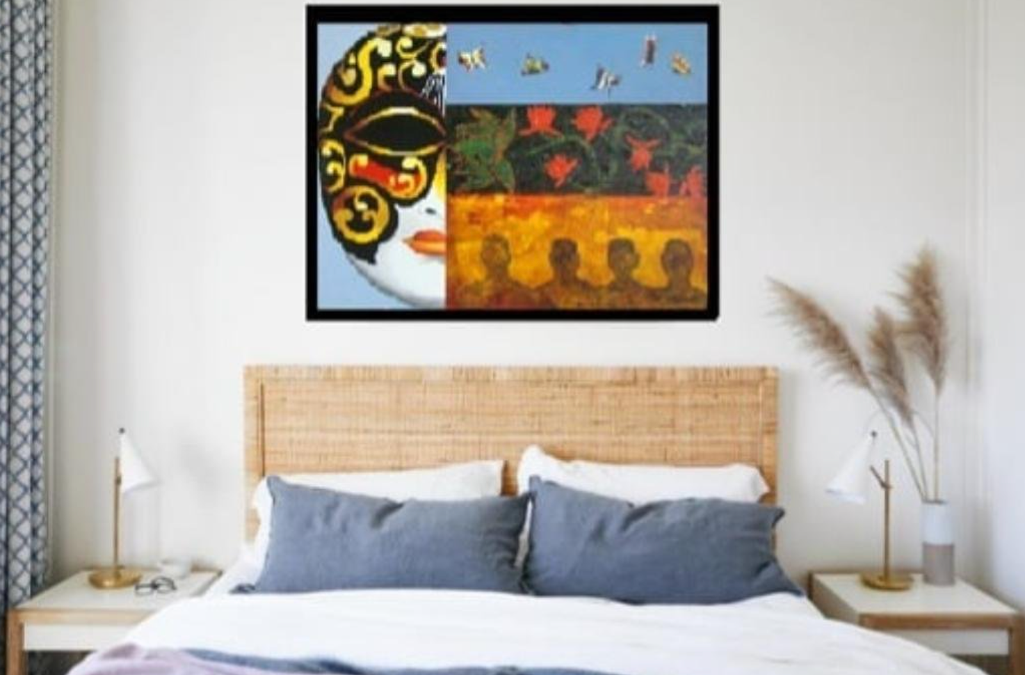 In this painting golf and black and gold Masquerade Masks symbolizes illumination, wisdom, prestige, and class. The blue color in this painting represents the ocean and the sky it often symbolizes serenity, stability, inspiration, wisdom, or health. the red color petals represent courage, respect, constancy, admiration, and, of course, desire. and yellow is the color that is associated with the intellectual activity of human beings.